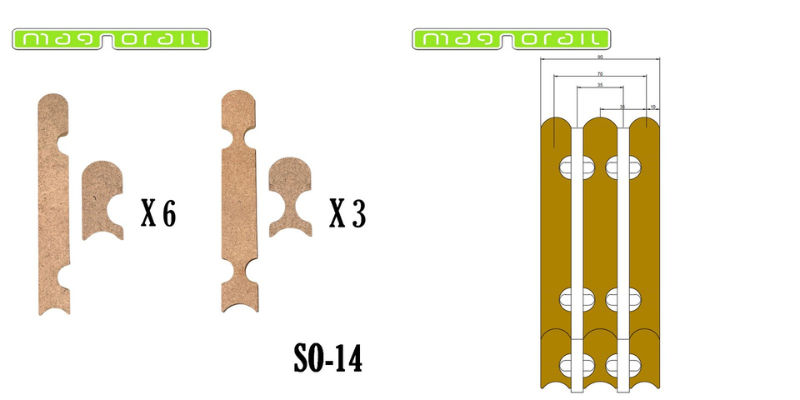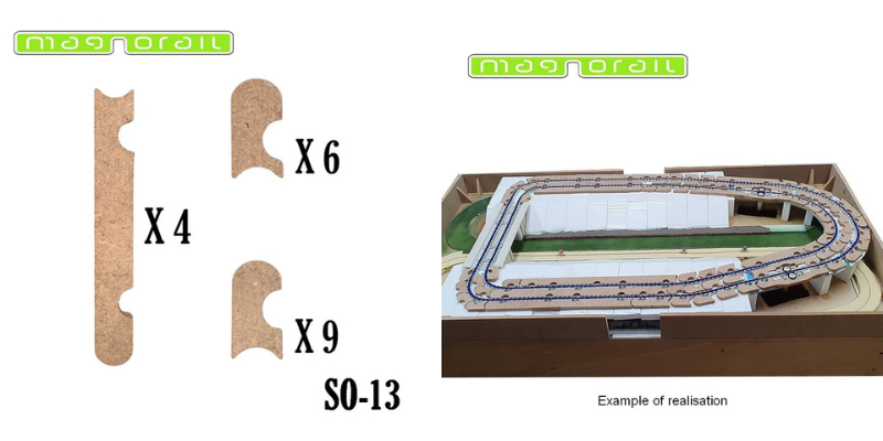 The SO-13 is specially designed to cover 60 cm of track in a mixed layout. It includes 4 long elements for straight sections, 6 short elements with lower openings, and 9 short elements with upper openings, allowing you to cover 20 cm in straight line, 20 cm in a curve, and the remaining portion adjustable according to your layout.